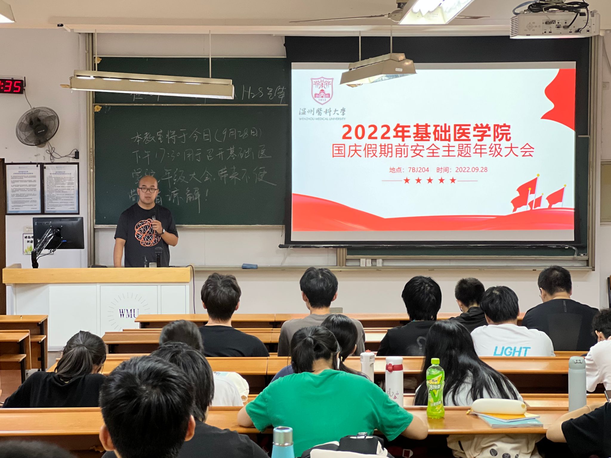 为进一步落实学校和学院党委相关会议精神,提高学生安全意识,做好国庆前安全教育工作,9月28日,NT动漫 召开安全主题年级大会,开展安全教育,安排部署年级工作。学生辅导员彭翔主持此次会议,全体基础医学专业参加大会。会上,辅导员彭翔提醒全体同学要切实提高安全意识,做到防火防盗防电信诈骗,拒绝“网贷”,远离黄赌毒,警惕非法宗教活动影响,保护好自己人身和财产安全;辅导员结合校园典型案例和实用的安全知识,从消防安全、...