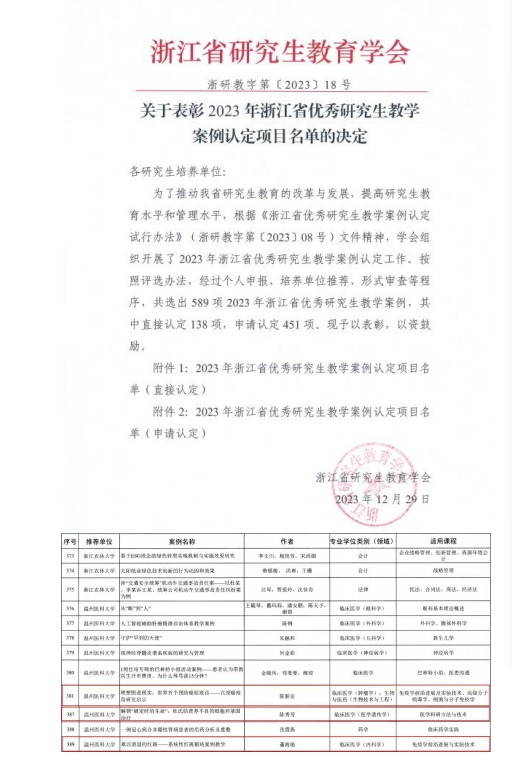 12月29日,浙江省研究生教育学会公布了2023年浙江省优秀研究生教学案例认定名单,学院3项研究生教学案例成功入选。