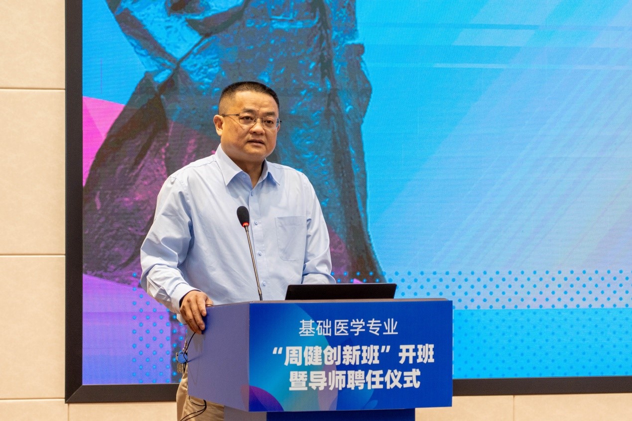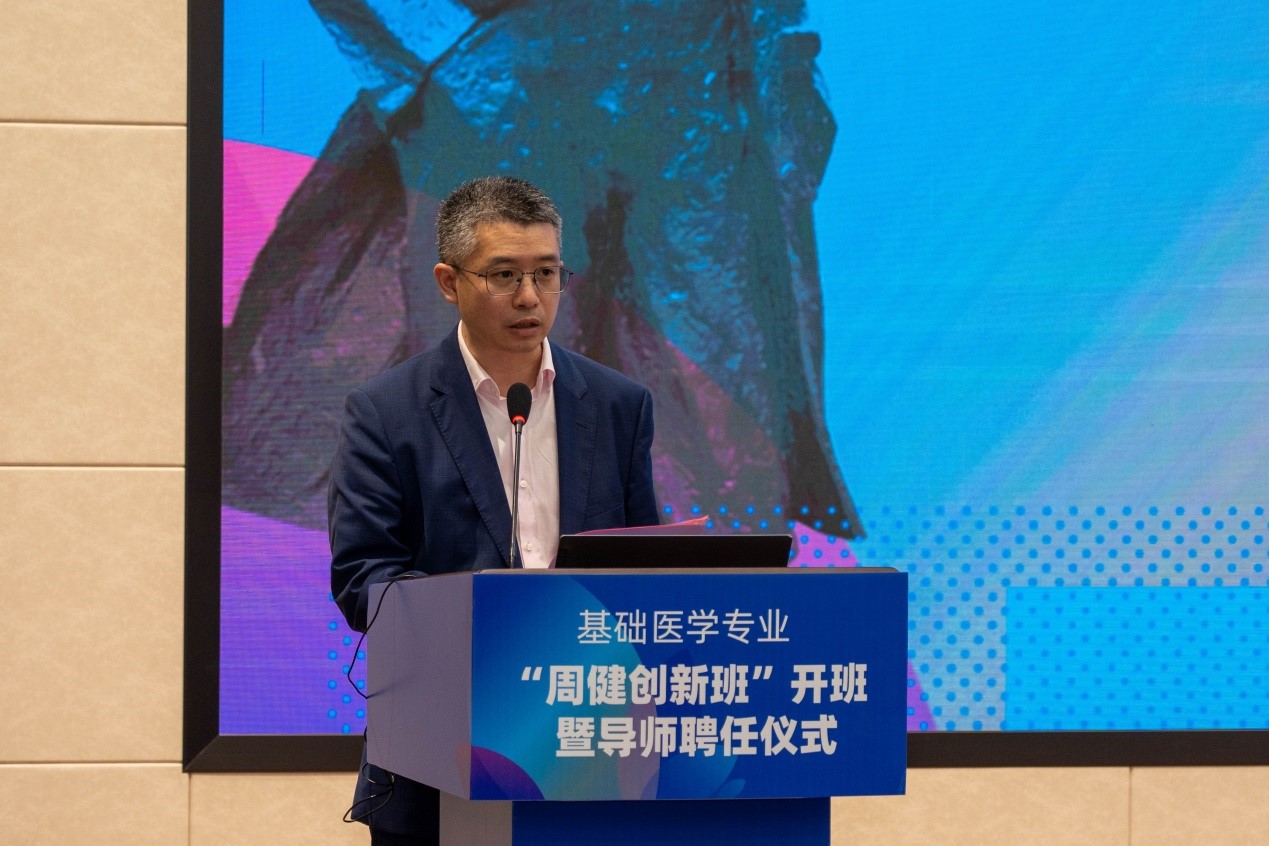 薛向阳作开班动员讲话,他介绍了基础医学专业“周健创新班”的培养理念、培养目标和培养模式。他表示,基础医学专业“周健创新班”始终以“培养基础医学拔尖创新人才”为目标,通过采取小班制、导师制、国际化等措施,落实本硕博一贯式培养,着力培养学生综合素质,努力培养未来的杰出基础医学科学家和教育家。