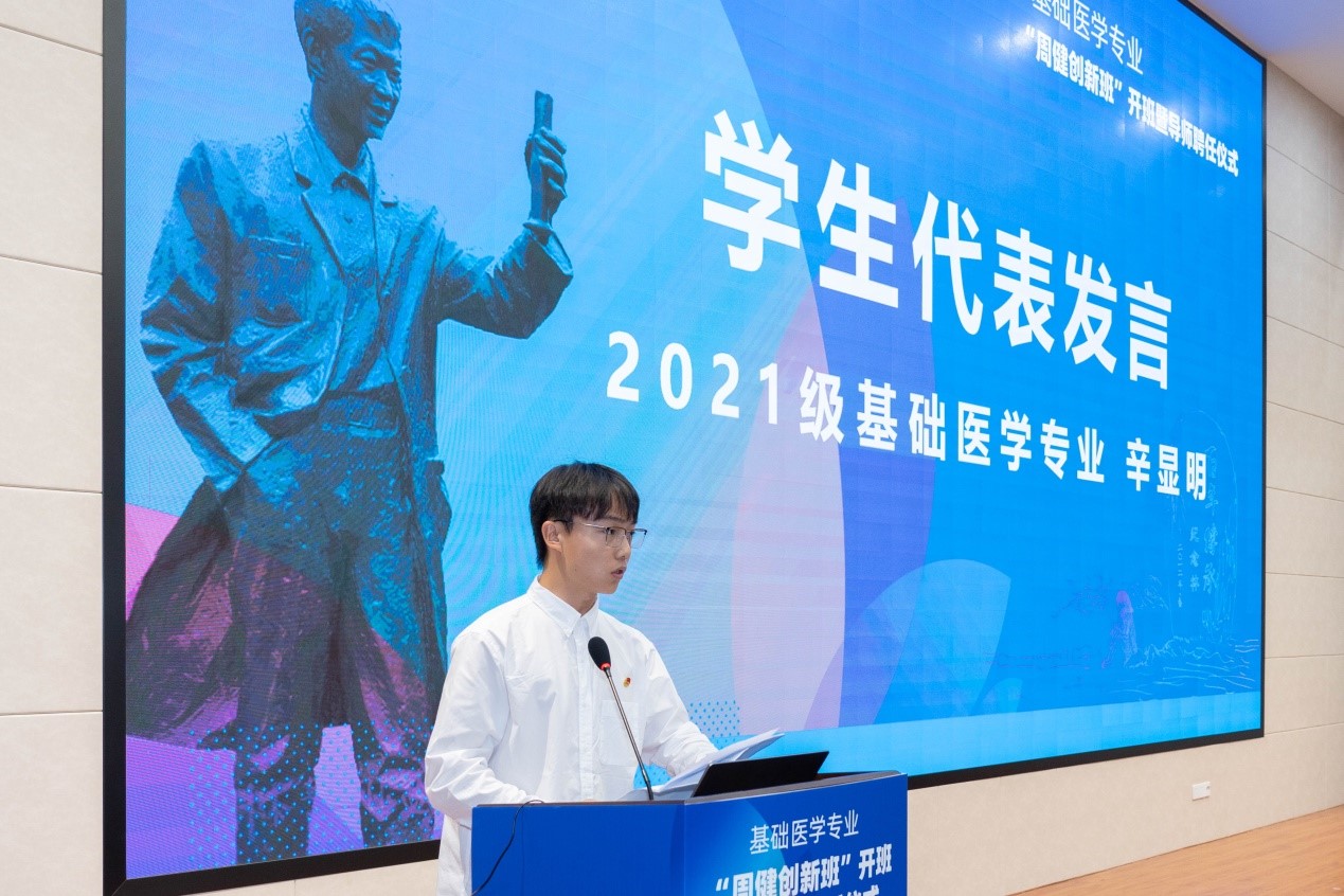基础医学专业“周健创新班”的学生代表辛显明表示,学子们会传承“顶天立地、奇思妙想、仁心大爱”为内核的周健精神,以人人争当医学科学家的势头,事事务求勤勉刻苦的劲头,努力成为一名优秀的基础医学拔尖人才。