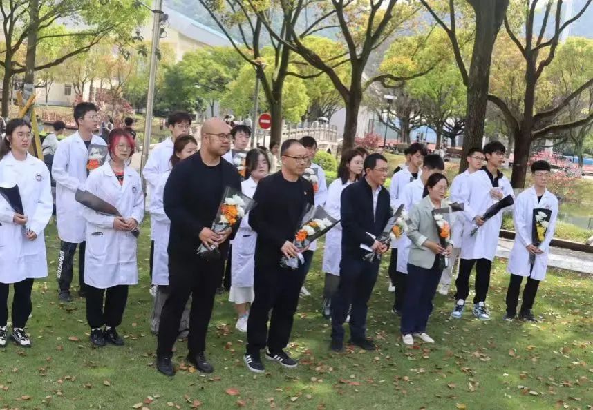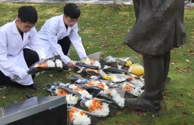 聆听事迹后,全体师生在周健博士铜像前整齐列队,肃立追思。在追思的无言中,同学们深切地体会到周健博士身上的医学科学家精神,为医学界做出的巨大贡献。接着,两位学生代表上前擦拭周健博士铜像,随后全体师生依次上前敬献花束,以表达对周健博士的敬仰、追思之情。