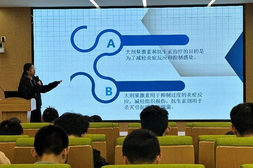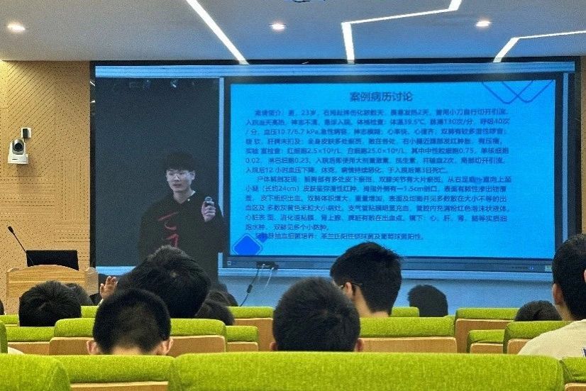 第二环节,PPT汇报环节,两校各选派两组同学就案例所涉及的内容进行主旨汇报,包括病程介绍、案例分析、诊断依据、可能的诊断、危险因素及防治经验等,同学们各抒己见,现场气氛活跃,碰撞出许多思维的火花。