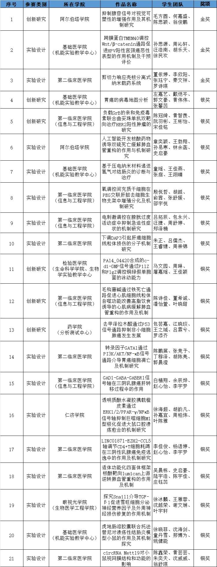 (机能实验教学中心)、检验医学院(生命科学学院、生物学实验教学中心)、药学院(分析测试中心)、第一临床医学院(信息与工程学院)、第二临床医学院、眼视光学院(生物医学工程学院)、阿尔伯塔学院、仁济学院等8个学院200余位师生组成的44支队伍进行现场决赛。现场评委由来自多个学院、不同学科领域的6位专家教授组成,赛制严格实行双盲评审制度。