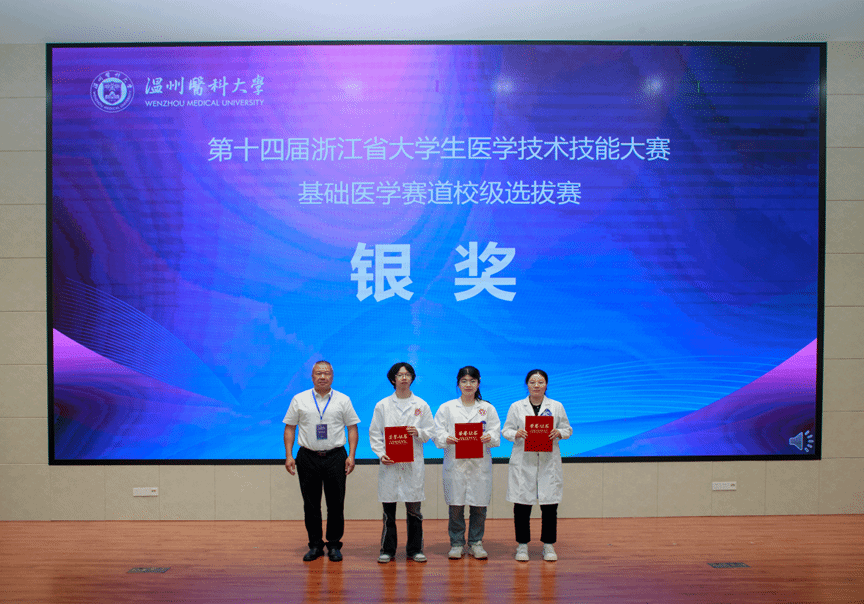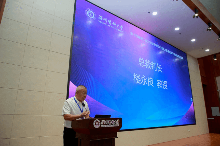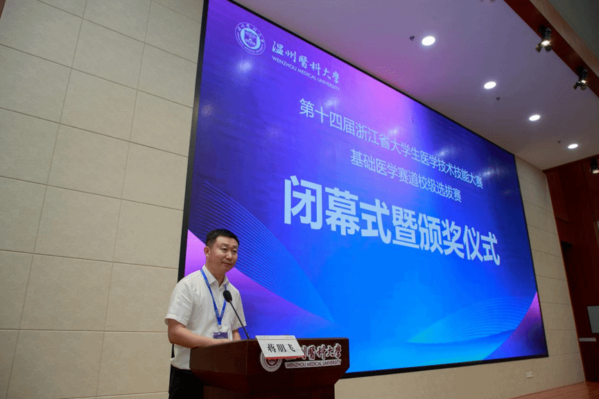 郑飞中致闭幕词。他对本次校赛的成功举办和所有参赛队员取得的成绩表示衷心祝贺,对裁判、评委、工作人员及志愿者们的辛勤付出表示感谢。他指出,通过本次比赛感受到参赛学子对基础医学的热爱,用实际行动诠释了“仁肃勤朴、求是奋发”校训精神,展现了当代温医大学子的风采。接下来,学校将选派优秀团队参加省赛,希望参加省赛选手继续发扬竞赛精神,不忘初心,砥砺前行,奋力拼搏,勇创佳绩 !
