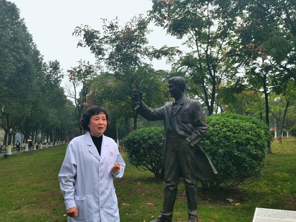 “漫步在校园绿荫下,我正和名人打招呼,走到周健博士的雕像前,仰起头望。