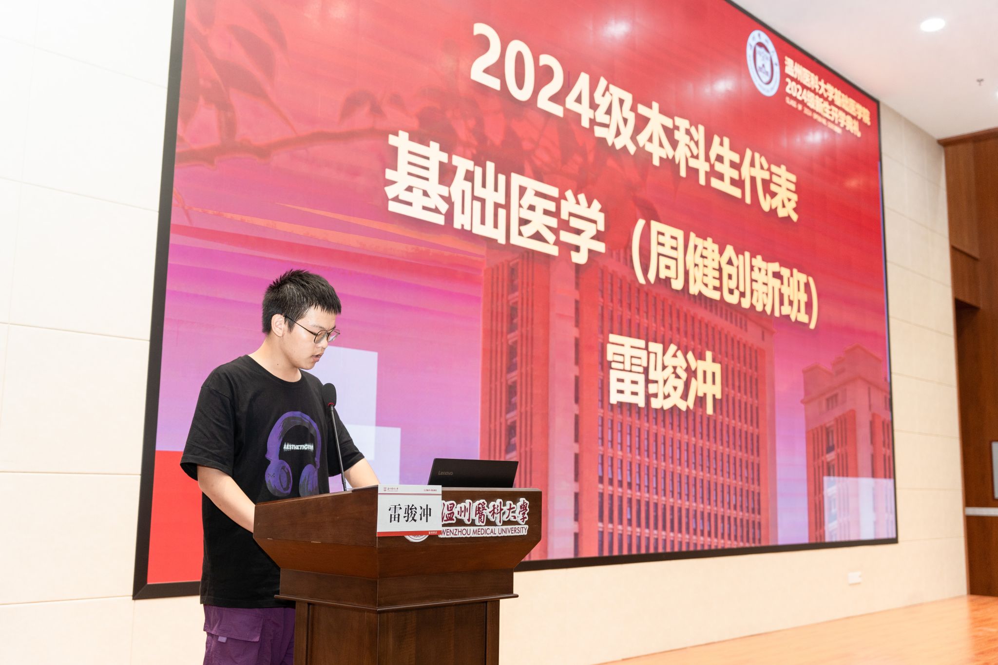 2024级本科生新生代表雷骏冲同学表达了对未来新的校园生活的向往和基础医学求学的热切渴望。他通过分享对校园风光和师生接触的初印象,表达对未来大学生活的美好畅享,更期待未来同学们共同努力,努力学习专业知识,实现追求与梦想。