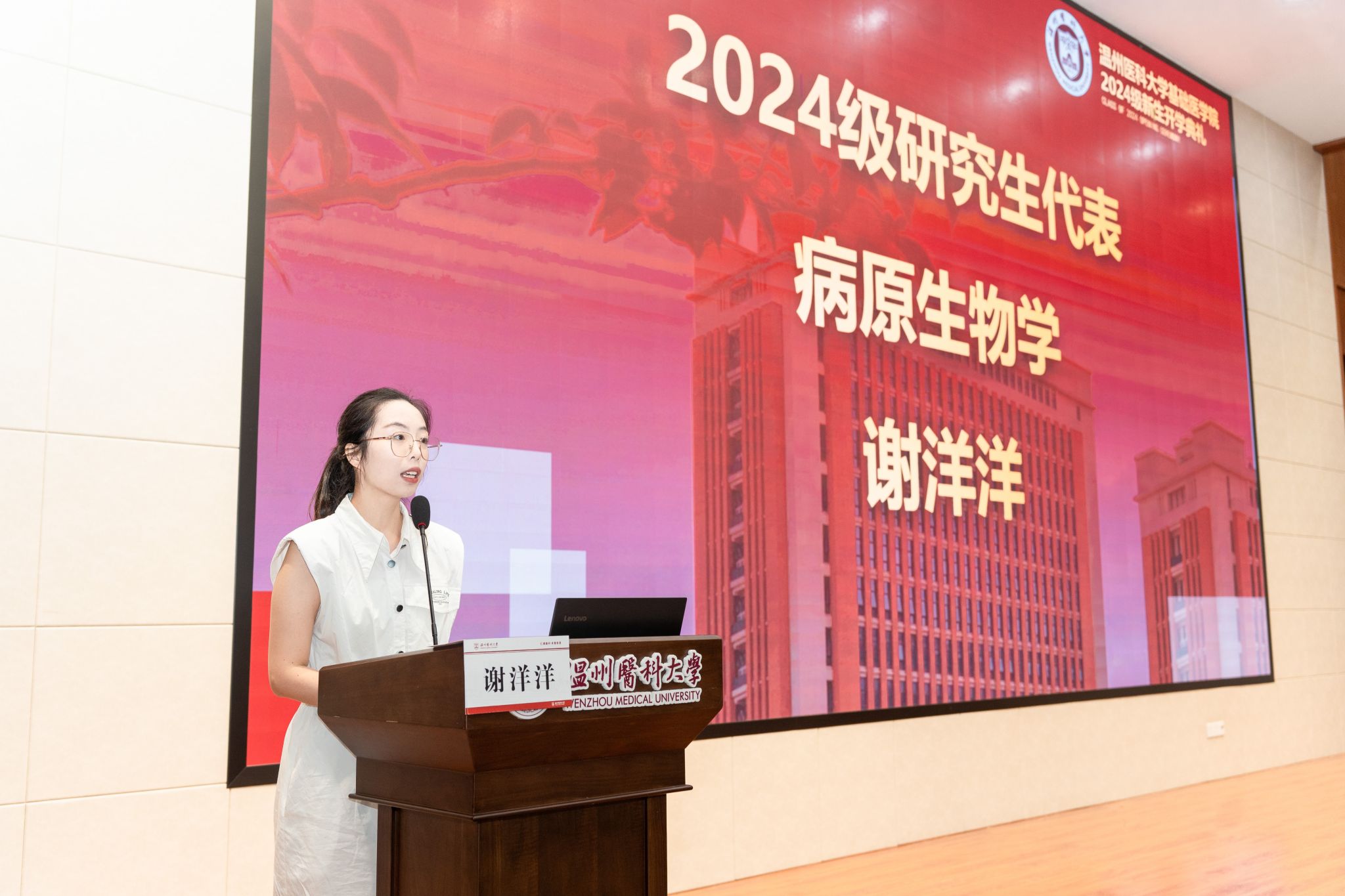 2024级研究生新生代表谢洋洋同学发言,她通过分享学校建校以来涌现的医学前辈的故事,传递激励医学学子不断前行的正能量,也鼓励同学在实验室和生活中不断创新、前行。她表示作为研究生,更要把握机遇与挑战,要有担当,努力探索科研的“金字塔”,寻求创新,在实践中坚持理想,砥砺前行