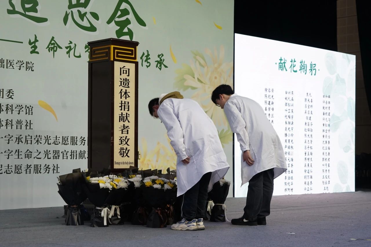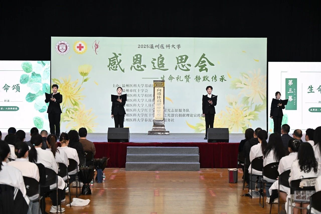 “犹如大旱之后的一场甘霖,那纯洁的灵魂,在另一个生命上悄然延续” “我们是您未曾谋面的学生”……活动现场,同学们通过介绍遗体捐献者生平事迹、献唱、诗朗诵等方式,向捐献者及家属致以崇高敬意。艺术表达与医学人文精神交织成对奉献者的深切缅怀,一个个平凡而伟大的生命故事在追思中焕发光彩。