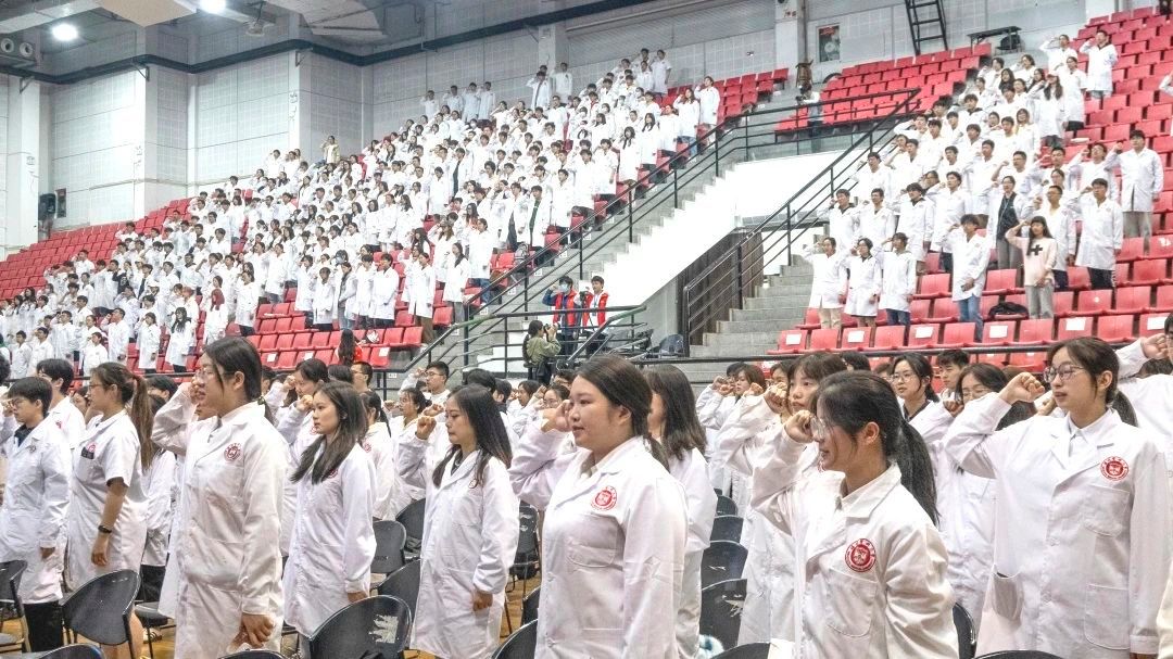 仪式尾声,师生手持素菊列队缓行,在遗体捐献者的纪念桩前垂首默哀三躬。“正心恭行,追深辨细;德彰术精,修成大医。”最后,全场医学生庄重宣誓,许下医者仁心的诺言。
