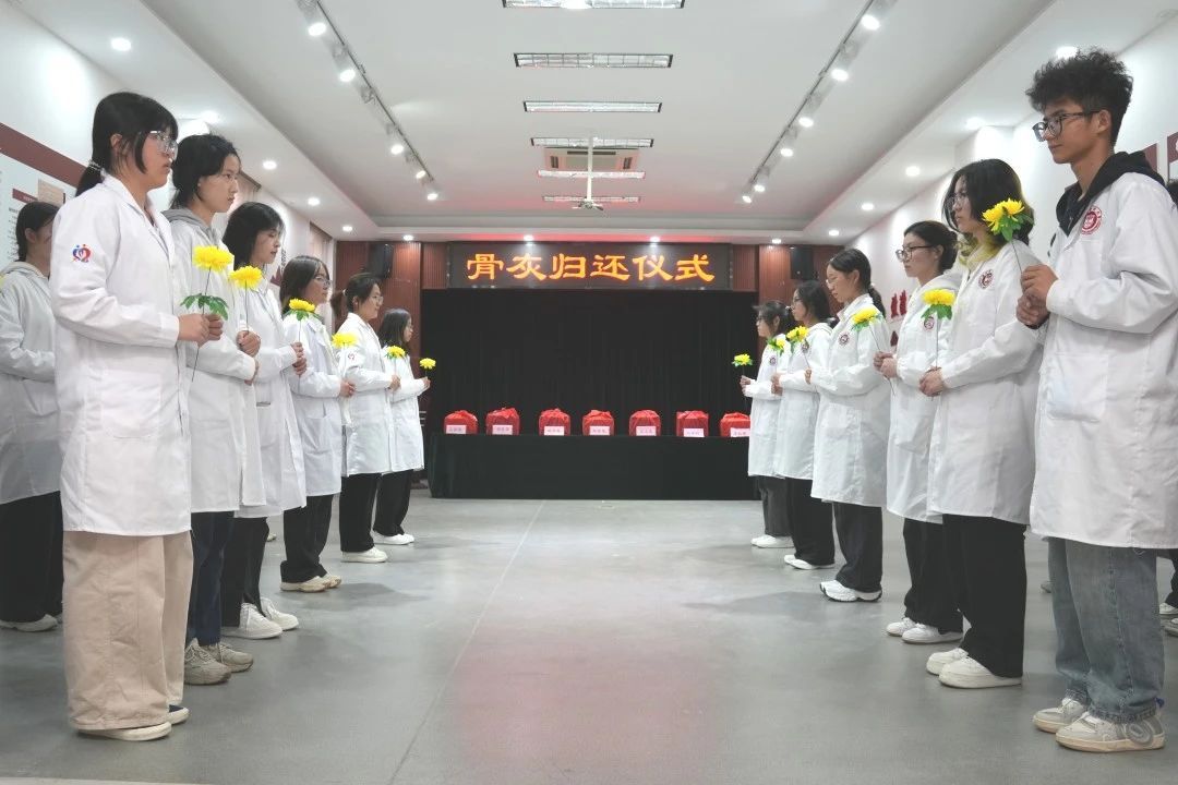 人体科学馆内,举行了7位“大体老师”骨灰归还仪式。