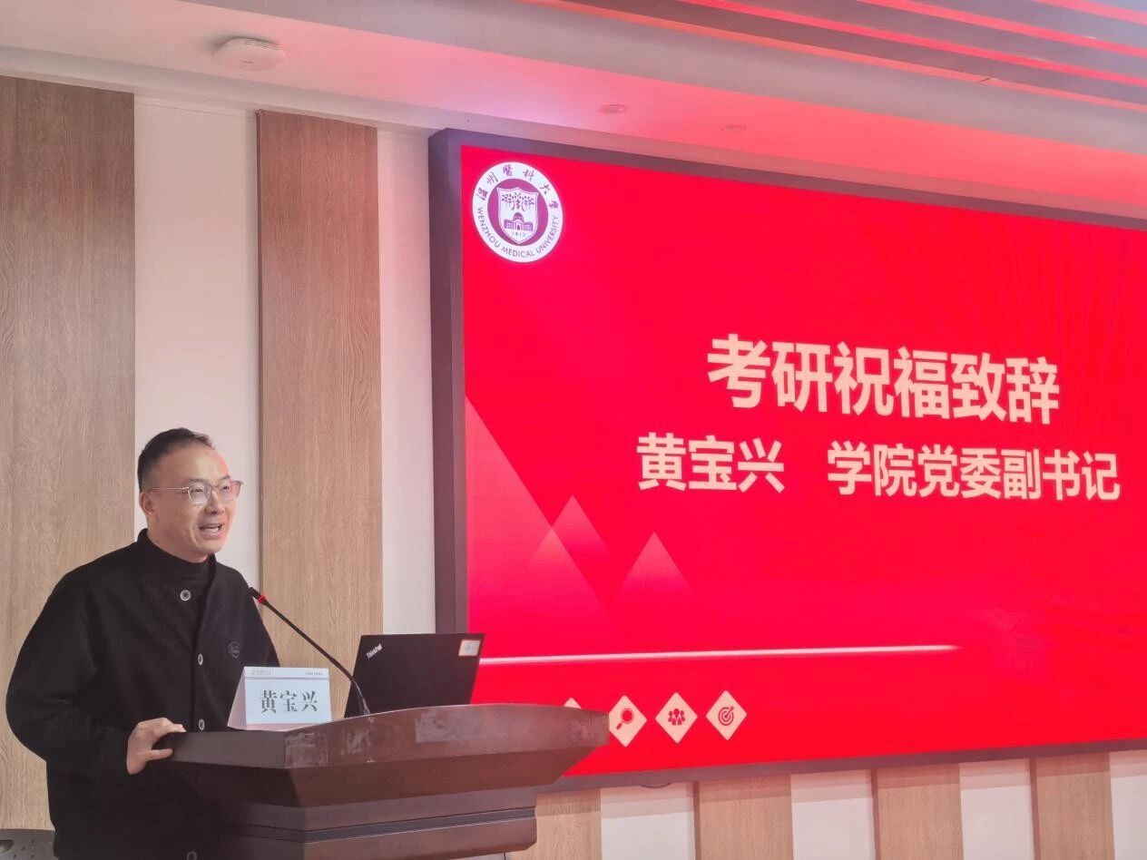 黄宝兴副书记向全体考研学生祝福致辞。他以院庆二十周年的办学历程和“明德铸基 博新立础”的院训,向全体考研学生表达了殷切的期许。他表示,考研之路虽布满荆棘,但每一份坚持都值得被肯定,每一次拼搏都将有回响。他鼓励,全体考生要在最后的冲刺阶段,既保持“咬定青山不放松”的韧劲,扎实推进知识复习,也要拥有“行到水穷处,坐看云起时”的从容,学会调节心态、劳逸结合。他提到,学院为每一位考生准备了“暖心助力礼包”,助力每一位考生都在考场上全力以赴。他强调,学院始终是同学们最坚实的后盾,将持续为大家提供全方位的支持与保障,助力学子们跨越难关、圆梦理想院校。