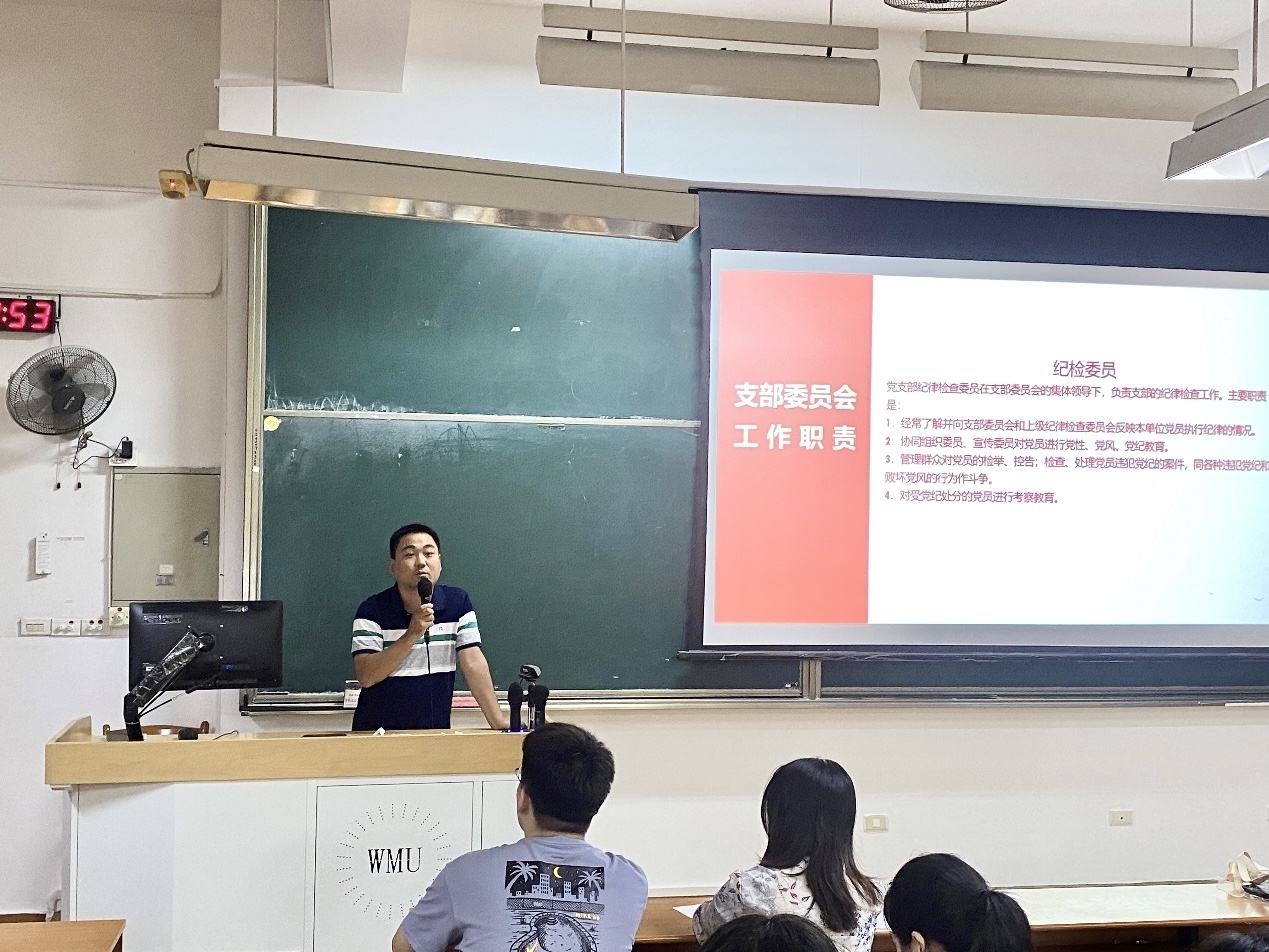 会上,由支部书记彭翔为大家详细介绍了支部委员会的组成以及各项工作职责,鼓励我们积极参加到党组织的工作中,创建先进基层党组织,争做优秀共产党员,发挥模范带头作用。