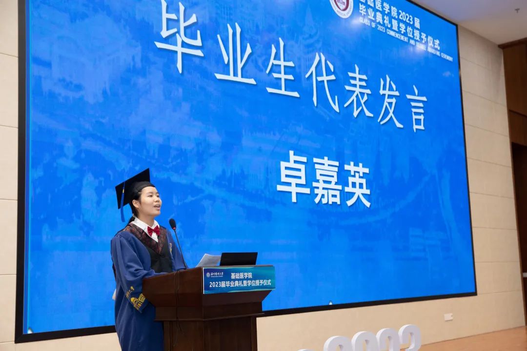 硕士研究生代表卓嘉英分享了自己三年的科研及生活经历,向学院和老师们表达了真挚的感谢和祝福,同时呼吁毕业生们要牢记“仁肃、勤朴、求是、奋发”的校训,将奋斗融入青春,做新时代有担当的新青年。