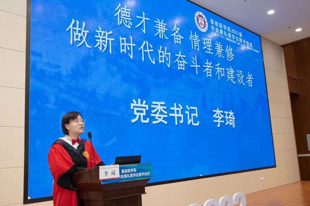 典礼上,李琦书记以“德才兼备 情理兼修-做新时代的奋斗者和建设者”为主题,给毕业生上了最后一堂党课。临别之际,李琦书记向大家表达了不舍之情,同时向毕业生们提出三点期待:一是毕业并非学习的终结,而是新的开始,要脚踏实地,追求卓越;二是能力越大,责任越大,要甘于奉献,勇于担当;三是在未来的人生中,要热爱生活,宽容自信,用豁达直面人生的高潮和低谷,用宽容应对人生的失落与坎坷。