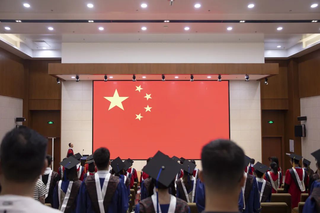 黄宝兴副书记主持2023届研究生毕业典礼,仪式在庄严肃静的国歌中拉开了序幕,全体成员起立奏唱国歌。