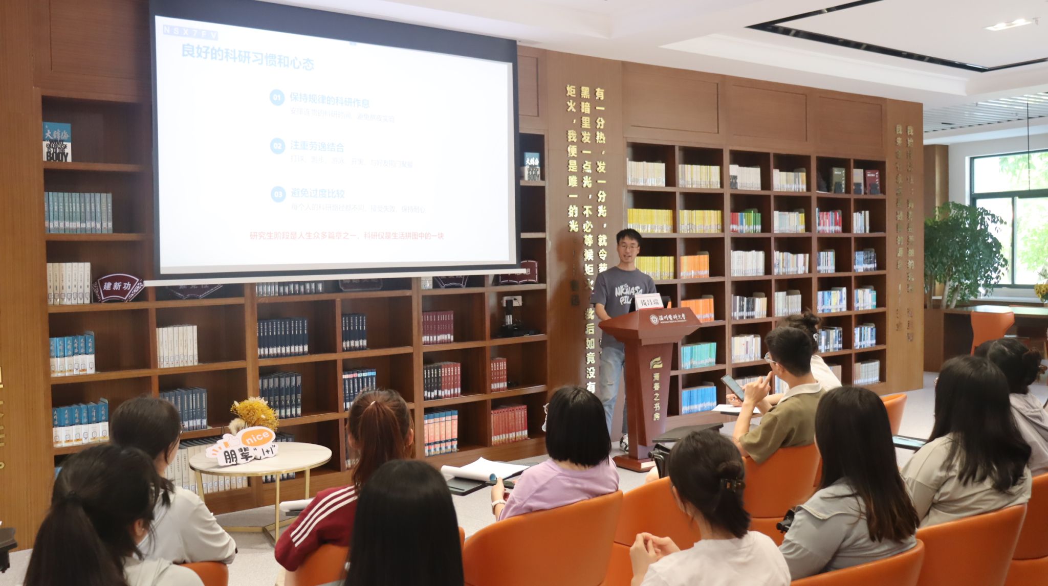 在图书馆青春之书房举行第一期朋辈“1+1”科研经验分享会。本期活动邀请到学院2021级基础医学专业优秀博士研究生钱昌瑞分享他在科研过程中的经验和心路历程,向师弟师妹们传授科研经验,答疑解惑,帮助他们更好地规划个人科研之旅、未来发展方向。