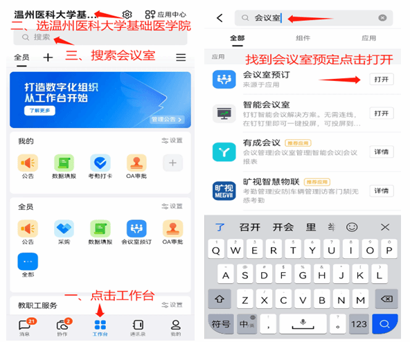 ,搜索会议室,点击会议室预定(可以直接钉钉扫以下的二维码跳过此步骤);