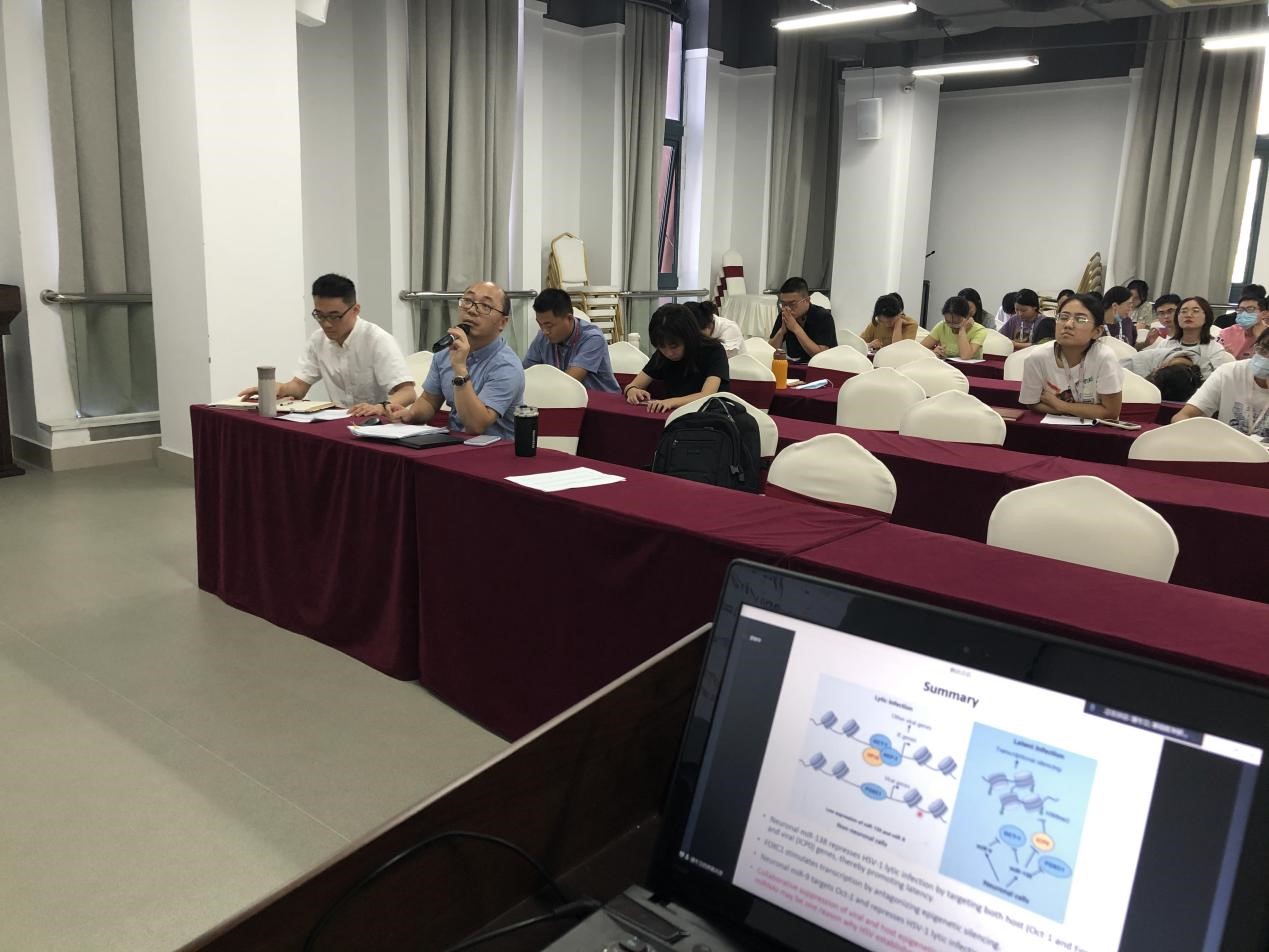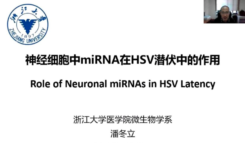 活动开始,潘冬立教授以“神经细胞中miRNA在单纯疱疹病毒(HSV)潜伏感染中的作用”为题,介绍了HSV的性质、引发的常见疾病和目前临床上的治疗手段,分享了靶标基因对HSV在三叉神经细胞复制增殖中的作用以及最新的研究成果。