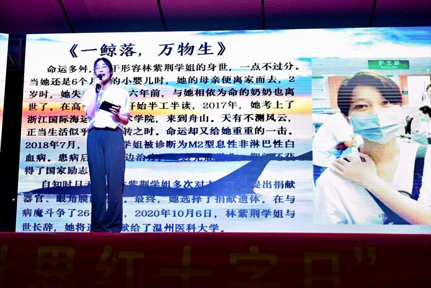 5月7日晚,由瑞安市红十字会主办的“生命教育 救在身边”———纪念第76个“世界红十字日”文艺演出在瑞安市明镜公园举行,承启荣光志愿服务队带去了《感恩的心》手语操和《一鲸落,万物生》故事分享两个节目。“感恩的心,感谢有你……”宛转悠扬的歌声中,身着鲜红志愿者服的承启荣光志愿服务队队员们有力地挥动双手,用手语和歌声传达着句句歌词的深意。同时也表达了温医大学子们心怀感恩的医者仁心情怀。“人不应该是插在花瓶里供人观赏的静物,而是蔓延在草原上随风起舞的韵律。”傅恒喆同学以《一鲸落,万物生》为题,将遗体捐献者林紫荆学姐的故事娓娓道来。坚强的林紫荆学姐勇敢面对生活中的种种困难,并在病魔折磨之下,毅然决定将遗体捐献给NT动漫
