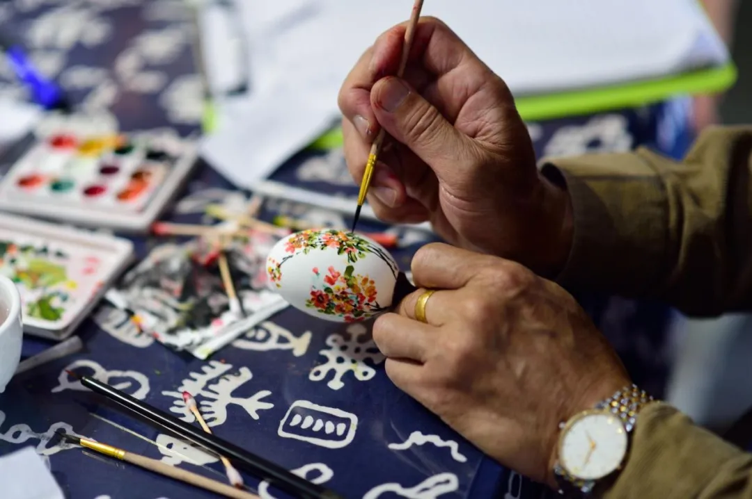 教职工们还参与了亲子非遗“温州蛋画”体验活动。蛋画传承人现场演示了在蛋壳上勾线、调色、绘图的传统技法,并指导会员们亲手创作。从打稿到上色,一颗颗素白的蛋壳逐渐蜕变为绘有山水、花鸟、人物的精美艺术品。活动过程中,传承人还分享了蛋画工艺的历史渊源及保护现状,会员们深刻感受到非遗文化传承的匠心精神。