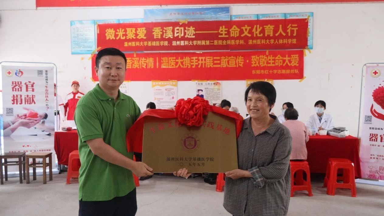 生命文化育人实践基地”揭牌。蒋朋飞对香溪村村民们的大爱精神和无私奉献的善举表示感谢:“捐献者用生命最后的馈赠照亮医学之路,我们不仅要铭记这份大爱,更要将‘敬畏生命’的信念融入医学教育的每一个环节。下一步,学院将开展系列走访,探访‘大体老师’所在的家乡,建设生命文化育人实践基地,以仁心熔铸医学之魂,培育德术并重的医学人才。”