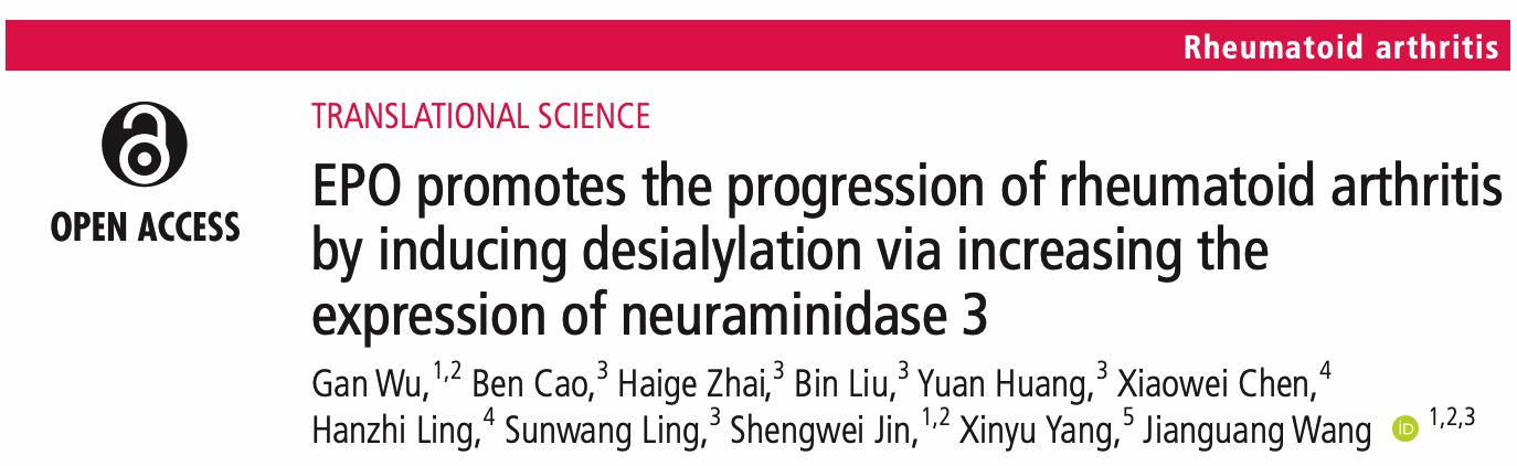 王建光/金胜威教授研究团队在风湿病领域权威期刊Annals of the Rheumatic Diseases(中科院一区, IF=27.973)发表了题为“EPO promotes the progression of rheumatoid arthritis by inducing desialylation via increasing the expression of neuraminidase 3”的研究成果,揭示EPO促进类风湿关节炎疾病进程的分子机制,为优化JAK抑制剂对RA的临床治疗策略提供理论依据。